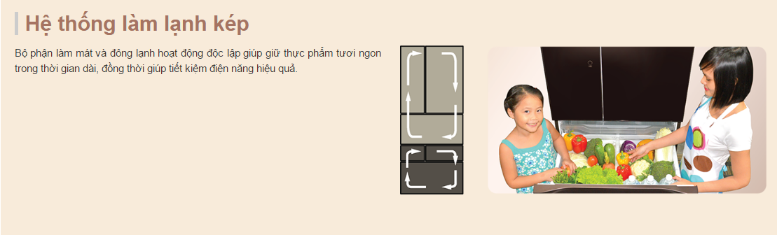 - Luồng khí lạnh giữa ngăn đông và ngăn mát hoàn toàn độc lập giúp đảm bảo nhiệt độ ổn định ở mức 4 – 5 độ C, tiết kiệm điện hiệu quả.