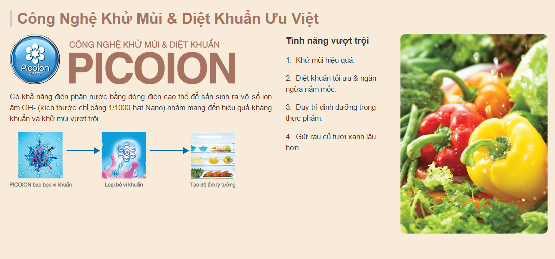 Công nghệ Picoion độc quyền của Toshiba có khả năng diệt khuẩn, khử mùi và ngăn vi khuẩn xuất hiện giúp đảm bảo vệ sinh an toàn thực phẩm.