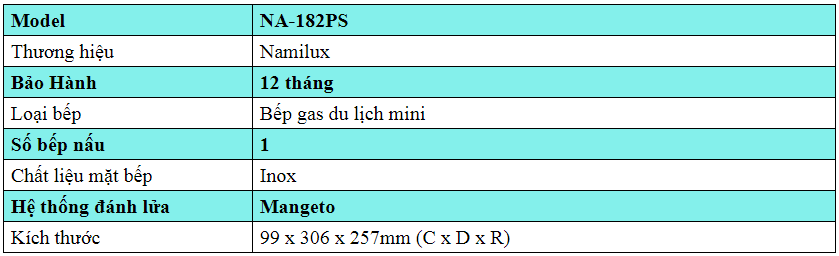 Thông số kỹ thuật Bếp gas du lịch Namilux NA-182PS