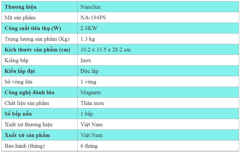 Bếp gas mini Namilux NA-194PS được thiết kế trên dây chuyền công nghệ hiện đại, với tính năng tiện dùng cùng khả năng cho ngọn lửa xanh và mạnh sẽ giúp bạn chế biến được nhiều món ăn ngon nhanh chóng. Ngoài ra, bếp gas có thiết kế nhỏ gọn dễ dàng di chuyển nên rất thích hợp trong những buổi tiệc liên hoan hoặc du lịch gời trời.