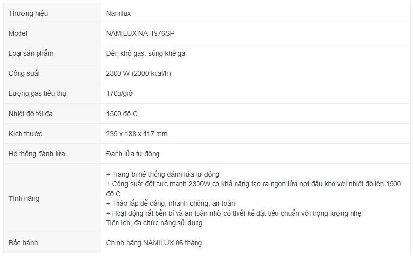 Đèn khò gas, súng khè ga NAMILUX NA-176SP, Thuộc thương hiệu liên doanh Việt Nhật NAMILUX sản xuất tại Việt Nam chuyên dùng để xuất khẩu qua các thị trường Nhật Bản và các nước Đông Nam Á , các sản phẩm Đèn khò gas, Súng khè gas này có thiết kế cầm tay đơn giản, nhỏ gọn nên có thể dễ dàng mang theo đến bất cứ nơi đâu. Đầu khò gas, súng khè ga dùng bình gas mini với cách sử dụng rất đơn giản ai cũng có thể sử dụng,
