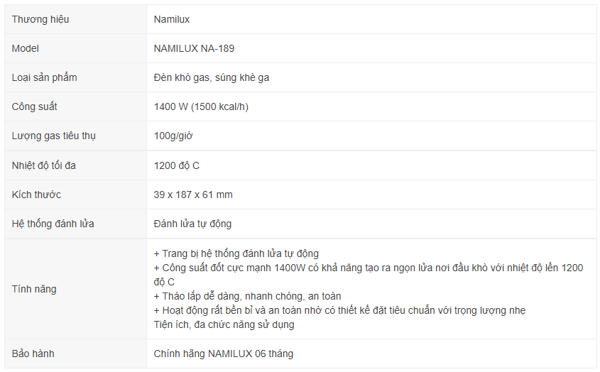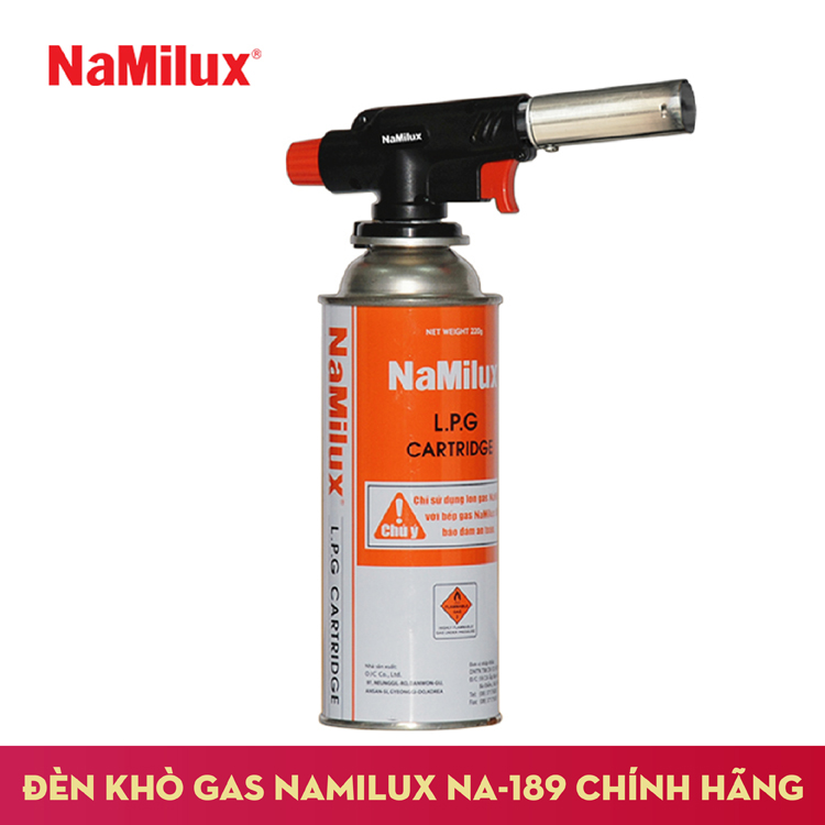 Đèn khò gas, súng khè ga NAMILUX NA-189, Thuộc thương hiệu liên doanh Việt Nhật NAMILUX sản xuất tại Việt Nam chuyên dùng để xuất khẩu qua các thị trường Nhật Bản và các nước Đông Nam Á , các sản phẩm Đèn khò gas, Súng khè gas này có thiết kế cầm tay đơn giản, nhỏ gọn nên có thể dễ dàng mang theo đến bất cứ nơi đâu. Đầu khò gas, súng khè ga dùng bình gas mini với cách sử dụng rất đơn giản ai cũng có thể sử dụng,