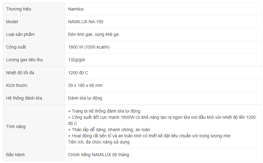 Đèn khò gas, súng KHÈ NAMILUX NA-195( N1822RF) thuộc thương hiệu liên doanh Việt Nhật NAMILUX sản xuất tại Việt Nam chuyên dùng để xuất khẩu qua các thị trường Nhật Bản và các nước Đông Nam Á. Các sản phẩm Đèn khò gas, Súng khè gas của Namilux có thiết kế cầm tay đơn giản, nhỏ gọn nên có thể dễ dàng mang theo đến bất cứ nơi đâu. Đèn khò gas, súng khè ga dùng bình gas mini với cách sử dụng rất đơn giản ai cũng có thể sử dụng được. (Sản phẩm không bao gồm lon gas mini)