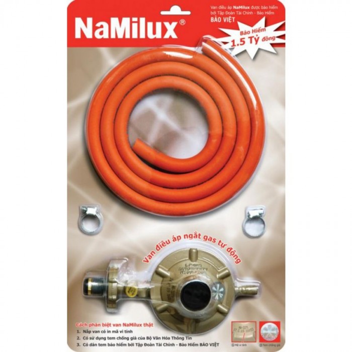 Van gas điều áp Namilux ấn tượng với chức năng tự động ngắt gas, phòng chống cháy nổ mọi lúc mọi nơi, điều áp gas ổn định hơn trong căn bếp gia đình, Ngoài ra Dây dẫn gas Namilux được nhập khẩu từ Nhật Bản với cấu trúc 3 lớp gồm: Lõi là lớp cao chuyên dụng NBR chịu gas, không bị lão hóa, độ bền cao. Kế đến là lớp lưới inox chịu áp lực cao, chống chuột cắn đứt dây gây rò rỉ gas. Ngoài cùng là lớp PVC chịu nhiệt có thể hoạt động tốt trong môi trường từ -5 độC đến 70 độC.